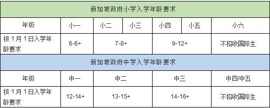 新加坡教育部不建议国际学生的年龄比同级本地学生的年龄大两岁以上。学生在新加坡初中将被进行分流,普通班学生毕业时参加新加坡N水准考试,快捷班学生可以参加新加坡O水准考试进入新加坡高等学府。