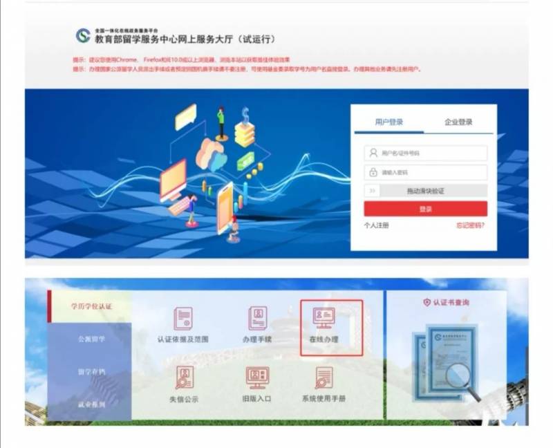完成个人注册后 进入界面 点击学历学位认证的在线办理开始办理