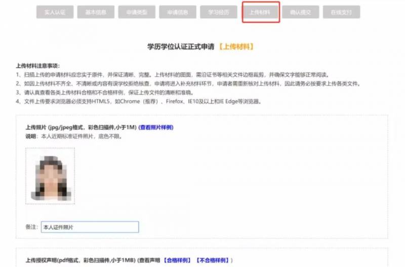 然后来到上传材料模块,之前的材料准备这时候就可以派上用场了。请注意这里的每一环节的材料上传都有样例以及合格非合格示范。