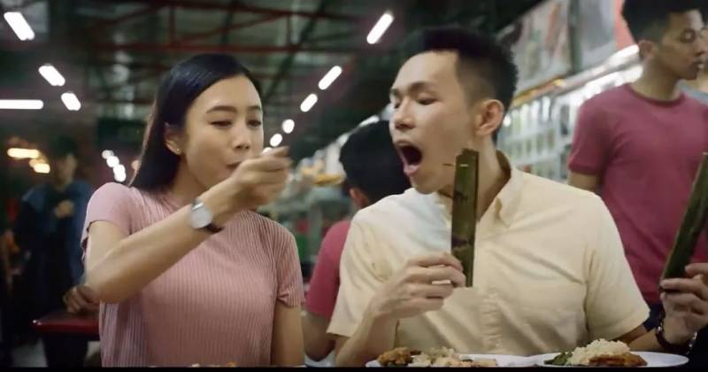 的开头,一名新加坡男子颇为自豪地带着马来西亚女生来到小贩中心吃“新加坡最好吃的椰浆饭”。