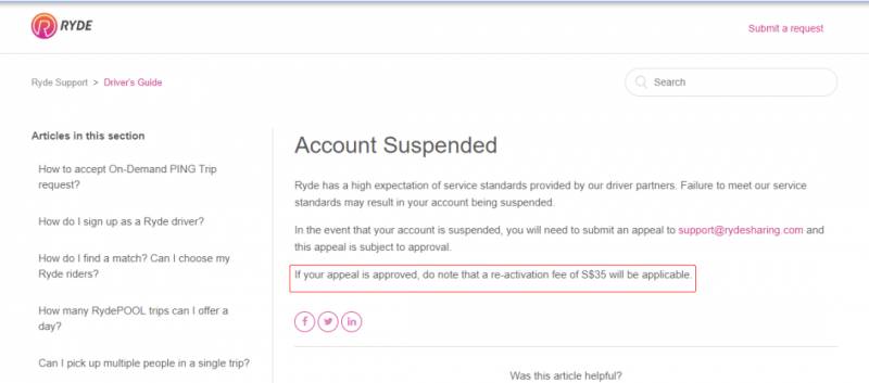 新加坡眼也查询了RYDE官网公布的条款,其中明确提到,账号被冻结后需付35新币来激活账户。