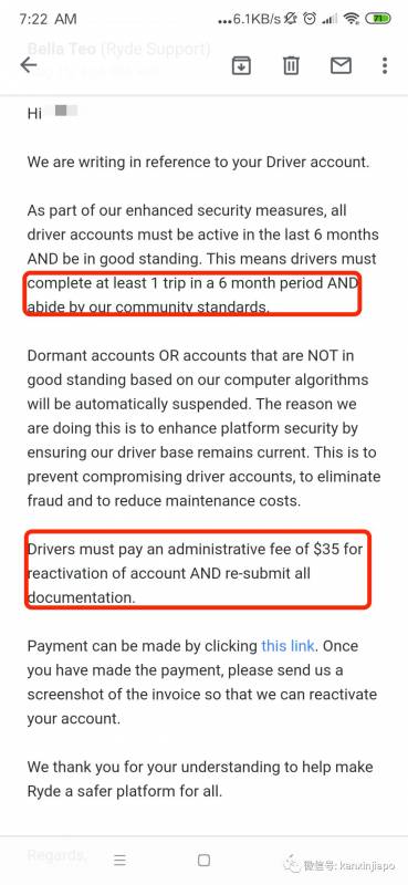 “和RYDE签约的司机,必须在6个月内至少完成1次行程。为了保证平台的安全性,处于休眠或是有不良信誉的账户会被自动暂停。而重新激活账户则需支付35新币,以及重新提交资料。”