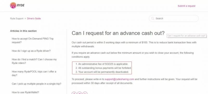 “目前您的RYDE钱包中有92.59新币,若要提取,我们将会收取25新币手续费。”