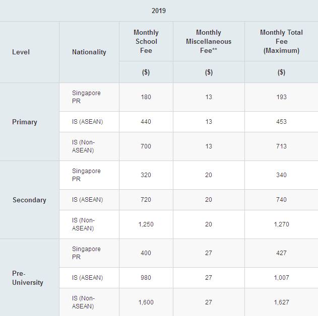 新加坡永久居民(SPR)和留学生(IS)从2019年至2020年支付的学校和杂费如下表所示: