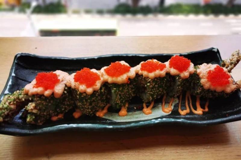 这一份明太手卷寿司,里面用了炸软壳蟹,吃起来口感松脆,上面铺满了蛋黄酱和明太子,入口满满的鲜香,过瘾!