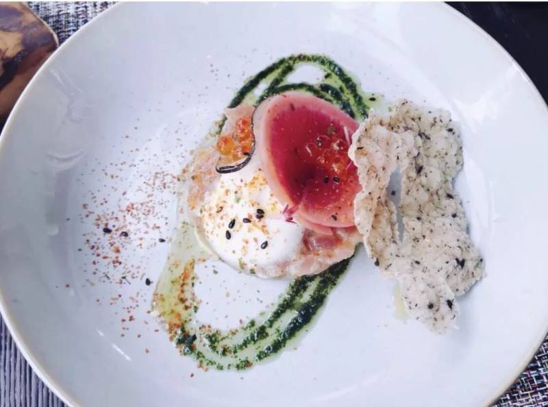 三文鱼Tataki,很多西餐的前菜都会看到,没有什么特别。但这一道,添加了Nichoise 尼斯沙拉,混著鳀鱼的沙拉,把紫苏碾成酱打底,几颗大大的北海道三文鱼籽,口味鲜咸。