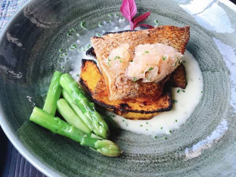 海鲈鱼由于太常见,在西餐中多是以煎的形式表现出来。这一道,煎的火候刚好,下面搭配了烤南瓜片,用奶油调和了白酱汁,上面撒了柚子粒,吃起来清新爽口,不错。