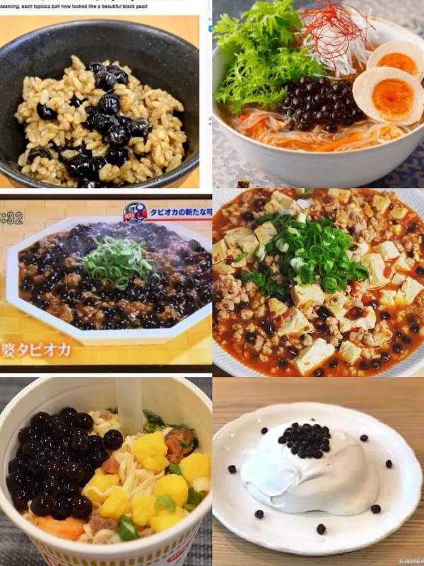 珍珠奶茶焖饭、珍珠奶茶麻婆豆腐、珍珠奶茶拉面,还有泡面杯吸珍珠的操作。