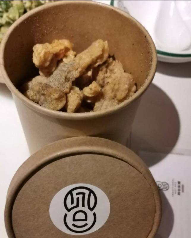 这一道酥肉,墙裂建议你无论如何点上,S$10块一份,猪肉切成条用生粉裹上下锅大火油炸,口感酥脆停不下来,用厚牛皮纸圆通盛着,吃不完可以直接带走。