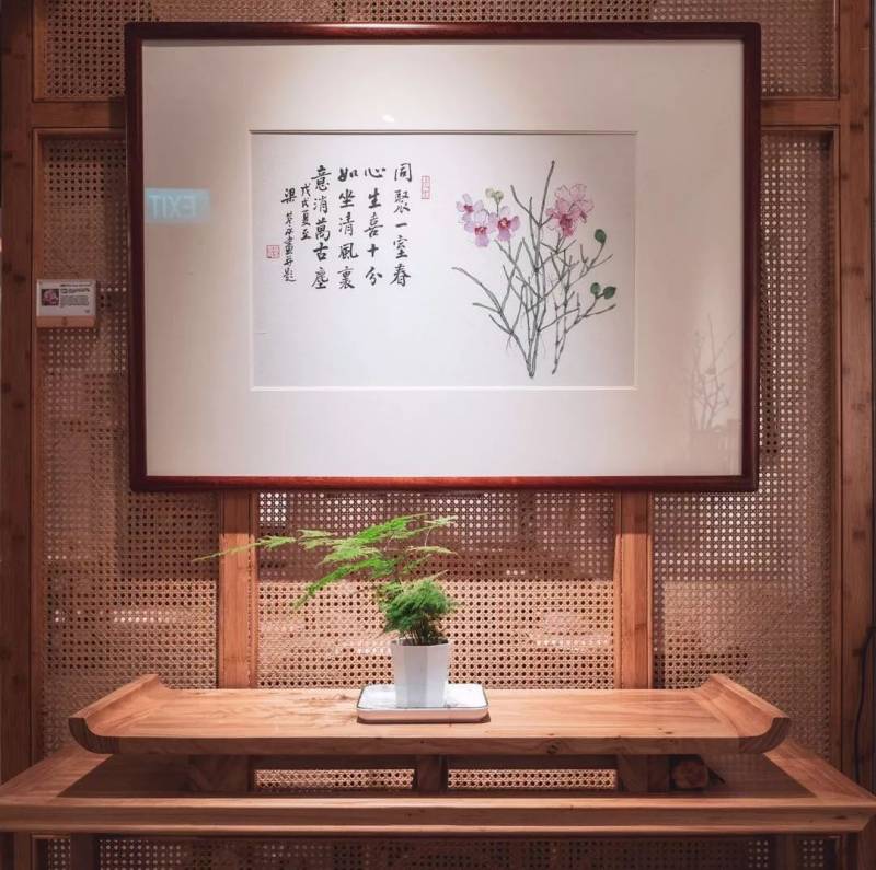 而店里的看点,又是可圈可点,广东名家梁基永亲手作画题字,一株卓锦万黛兰栩栩如生,藏头诗看得出这铜火锅是梁大师的真爱了。