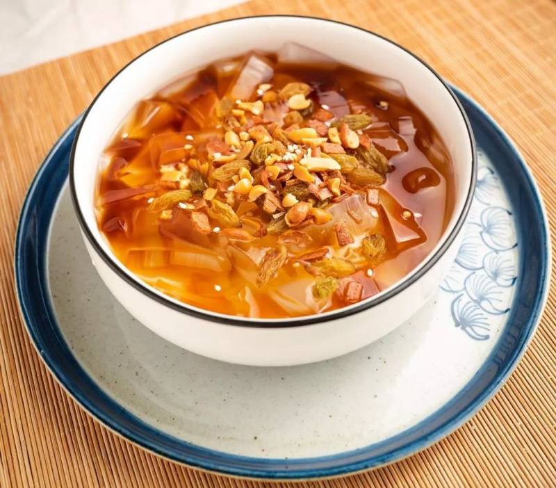 细腻凉粉淋上手工红糖,添加葡萄乾和花生粉,火锅后的满足感Max!
