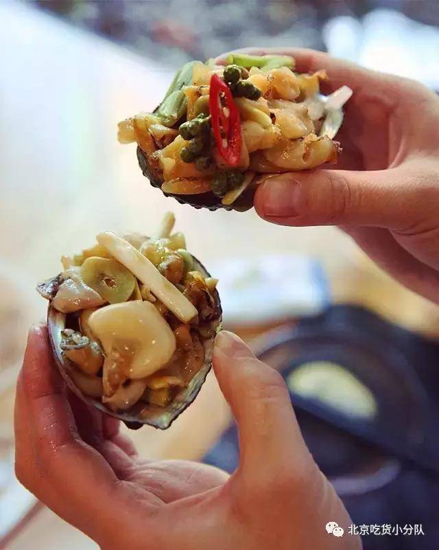里面藏着切好的冰镇鲍鱼片搭配自制的腊八蒜,吃起来酸辣脆爽。