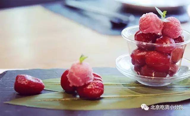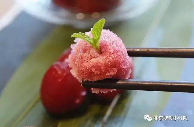 摆盘很雅致的东方美,番茄用洛神花腌制过,虽然是道小菜,也做得很细致,连上面的粉嫩冰霜也是番茄果肉急冻后打碎再做成,冰凉爽口。