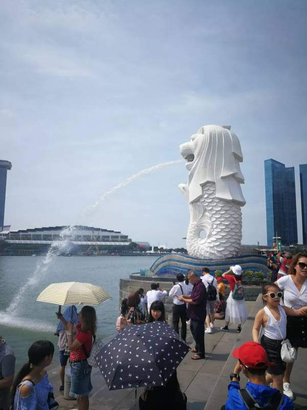 咸咸的海风还没吹拂几分钟,就被同行的伙伴们召唤,匆匆赶回,集体到鱼尾狮公园打卡,与法国的埃菲尔铁塔一样,洁白的狮头鱼尾像也是新加坡的象征。“到此一游”必拍的景点。鱼尾狮雕像下面挤满了人,我还帮一家印度人拍了张全家福。