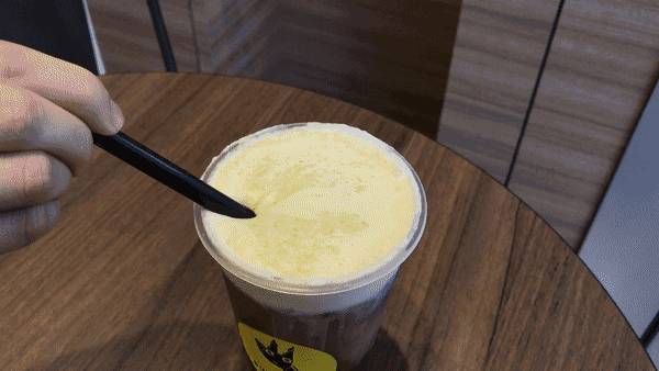 奶盖的表面基本没有气泡,口感绵密,入口带微咸,后味没有甜味,茶一拿到手奶盖就开始下沉。
