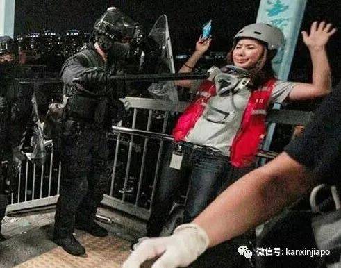 照片中的女记者高举双手,被警方用警棍直指脸部,她面露惊恐......