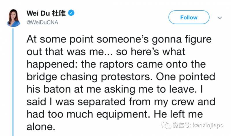 而这名记者,就是新加坡《亚洲新闻台》派去香港的杜唯!她觉得迟早会有人认出是她,于是决定在推特上还原事情的经过。