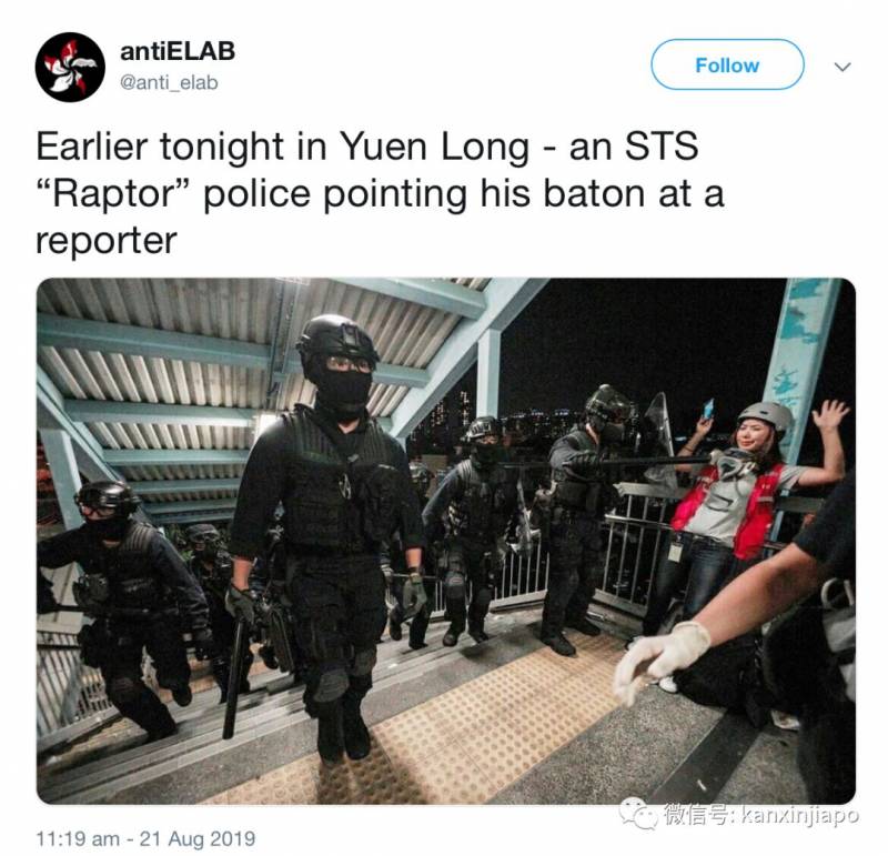 据原推在8月21日发布的po文称,“今晚稍早时,有一名特别战术小组(STS)警员,在元朗用警棍指著一名记者。”