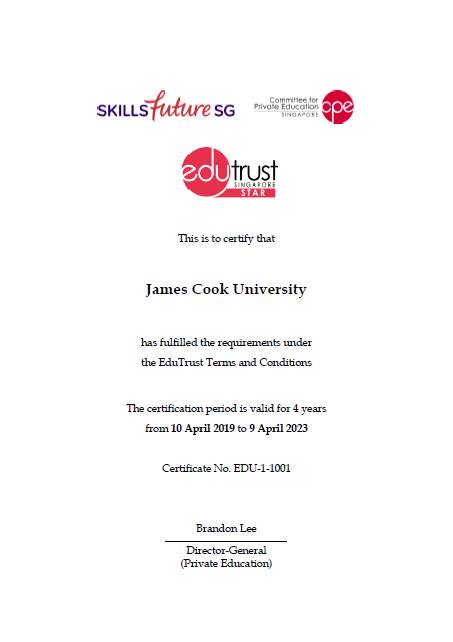 2019年,JCU通过新加坡教育部下属私立教育理事会的严格审核,延续了教育信托认证的最高标准——在2019-2023年,继续保持教育信托星级认证 (EduTrust Star) 资格。