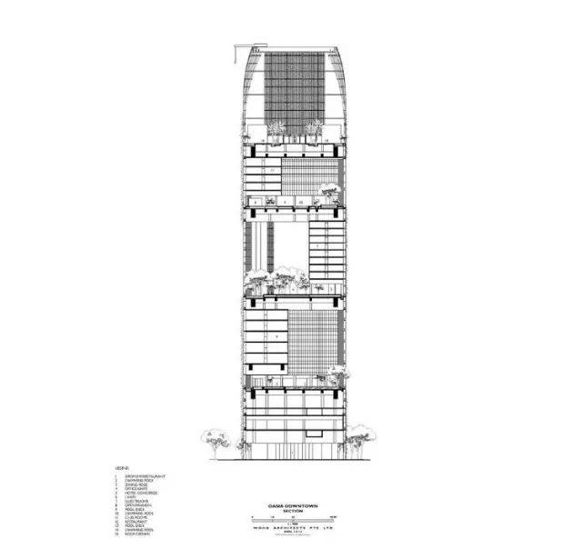 园林绿化广泛用作建筑外立面处理,并在建筑内部和外部形成主要的材料面板部分。酒店内部的天空花园成为天然的城市观景阳台,给予建筑的开放形式和视觉透明度。微风穿过建筑物能获得良好的交叉通风。公共区域的功能性变得更好,提供给客户更舒适的居住体验。这样的热带空间充满绿色,自然光和新鲜空气,而不是封闭依赖空调的内部空间。