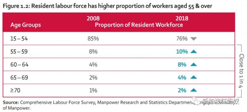 人力部2018年的就业数据也显示,我国就业人口目前有229万2700人,其中约四分之一(24%)是年龄在55岁及以上的年长员工。粗略计算,大概是55万人左右。若以新加坡560万人口来计算,占了约10%。可怕的是,15岁至54岁的年轻员工的百分比,过去10年内下降了9个百分点。(生育率下降的直接效应已显现)