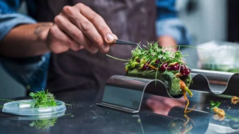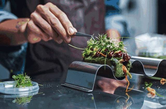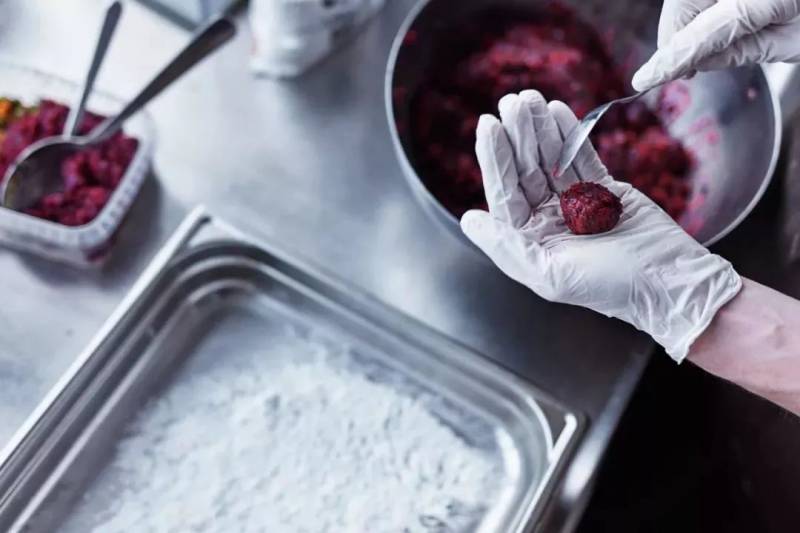 厨师把面包虫混合甜菜根、防风草和土豆