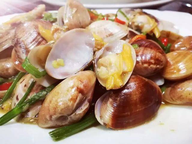 配合上香芹和小米椒爆炒,香味四溢,连贝壳里的汤汁都要舔干净。