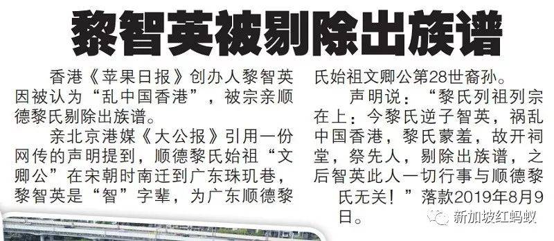 日前,香港媒体报道,《苹果日报》创办人黎智英已被宗亲“顺德黎氏”声明踢出族谱,双方再也没有关系,“事件曝光轰动中国微博”。