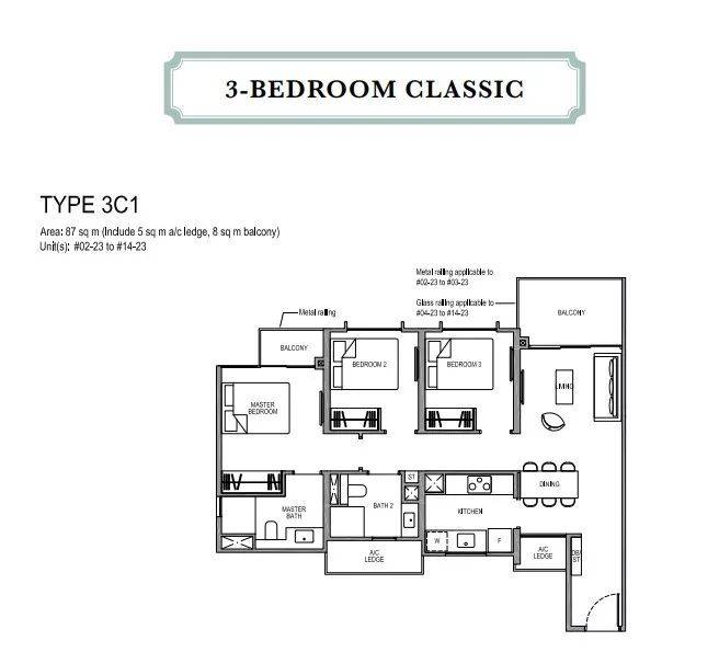 三卧室,套内面积82平方米(892平方尺)至104平方米(1120平方尺),整套售价从S$161.7多万新元起。