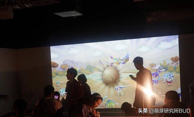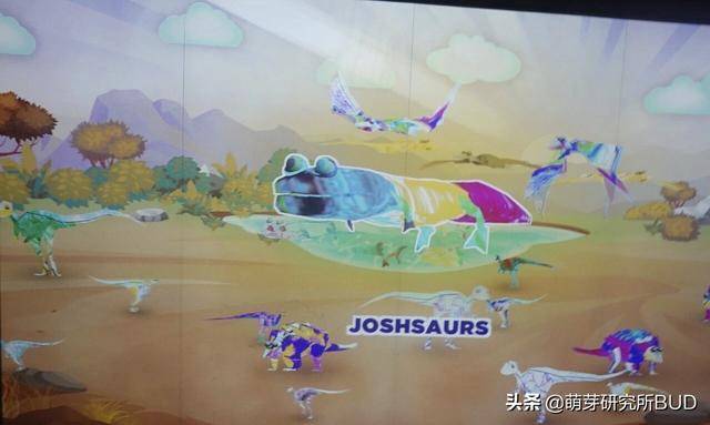 这是一个涂鸦区,大屏幕上有很多纸做的恐龙,很多孩子在桌子旁用纸涂鸦。很显然这是一个通过涂鸦,就可以在屏幕上把恐龙变出来的游戏。