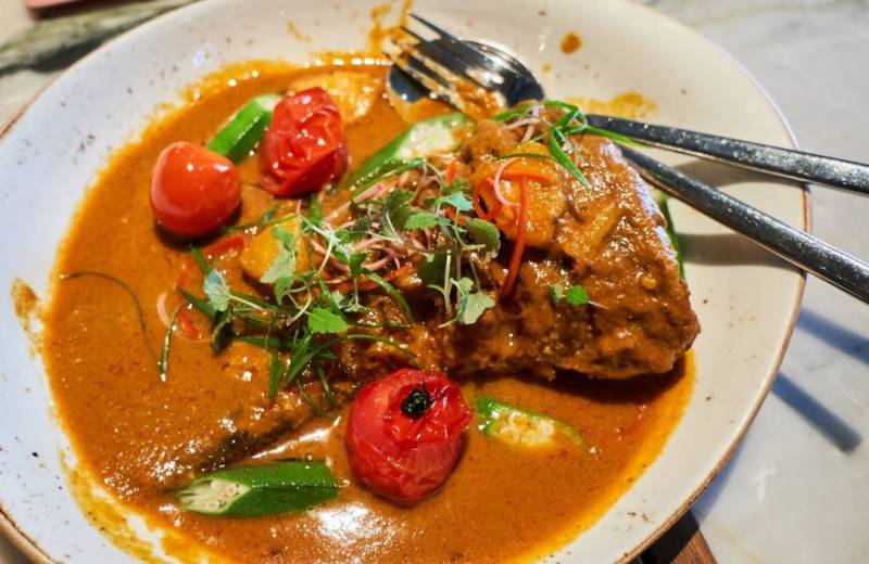 本地特色的主食都偏“重口味”,但餐厅也不缺些清新可口的菜肴来平衡。尖吻鲈沙拉(Barramundi Salad)便非常爽口,新加坡本土的生牛肉片与本地渔场养殖的尖吻鲈刺身,混合著姜花、红船鱼酱、辣椒和芝麻油,虽然简单,却非常符合大家的心意。