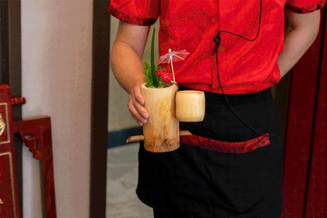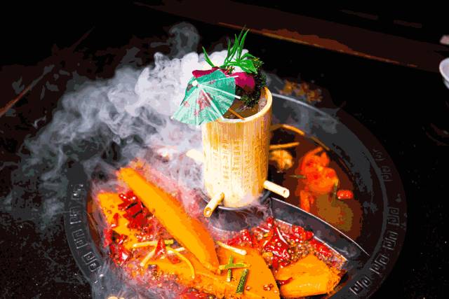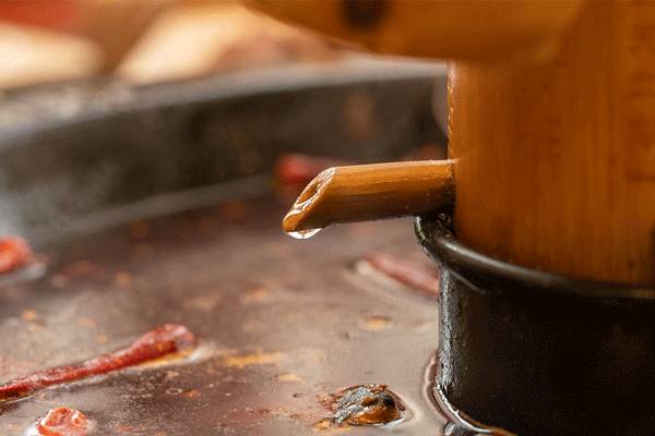 随着锅底温度的升高,凉茶渐渐融化,顺着天然青竹筒底部的四个小孔中滴入锅中,形成冰竹滴水的效果。