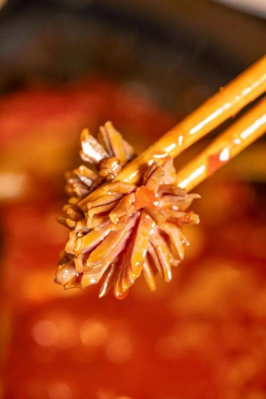 菊花状的鸭胗更容易吸收汤汁,烫熟后就像只小刺猬,一口咬下无比爽脆。