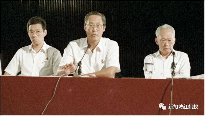 建国以来领导过新加坡的三个男人。右起为李光耀、吴作栋和李显龙,照片摄于1988年。(海峡时报)