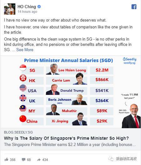 红蚂蚁今天(21日)发现,护夫心切的总理夫人何晶忍不住跳出来为夫君辩驳(虽然作为淡马锡控股首席执行员的她本身也经常被质疑爽领高薪),在面簿转载了一篇题为《为什么新加坡总理薪金这么高》的部落格文章。