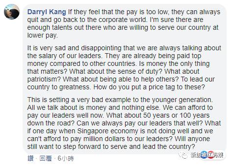 “这给我们的年轻一带树立了很坏的榜样。所有我们谈论的都是钱、钱、钱……如果有一天新加坡经济恶化,而我们再也无法支付上百万新元给我们的领导人了,还有谁会愿意站出来领导和为国家效力?”