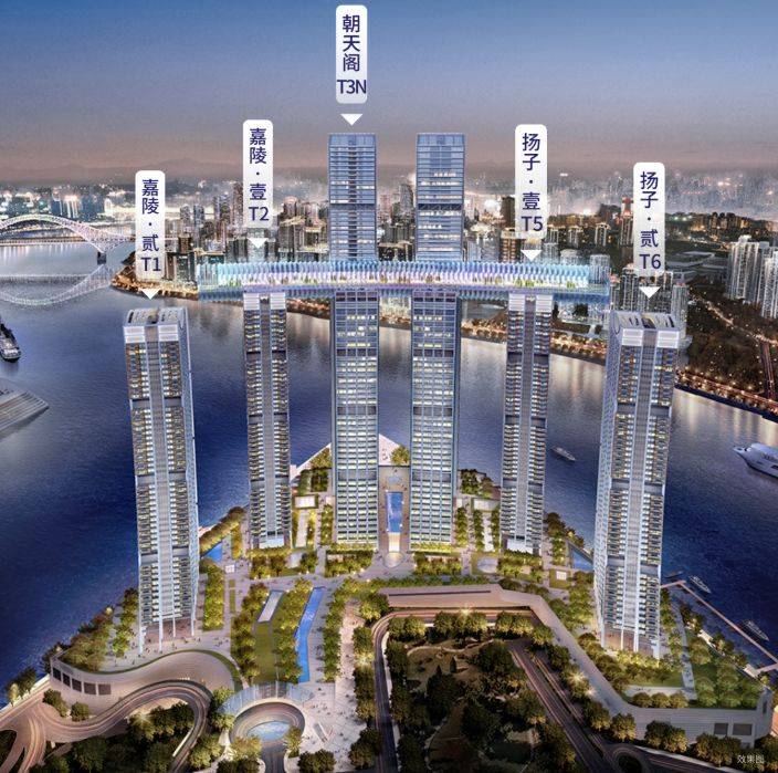 位于嘉陵江一侧的命名为嘉陵·壹和嘉陵·贰,位于长江一侧的命名为扬子·壹和扬子·贰,最高的那栋住宅名为朝天阁。
