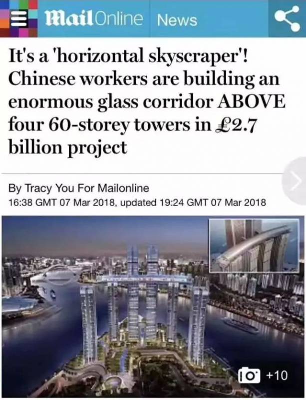 “中国建筑工人即将建成耗资27亿英镑的巨型商业建筑群,在1000英尺高的楼顶还盖了一座令人难以置信的‘横向摩天大楼’”