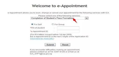 在下拉栏里选择Completion of Student’s Pass Formalities,填写相应信息进行预约。