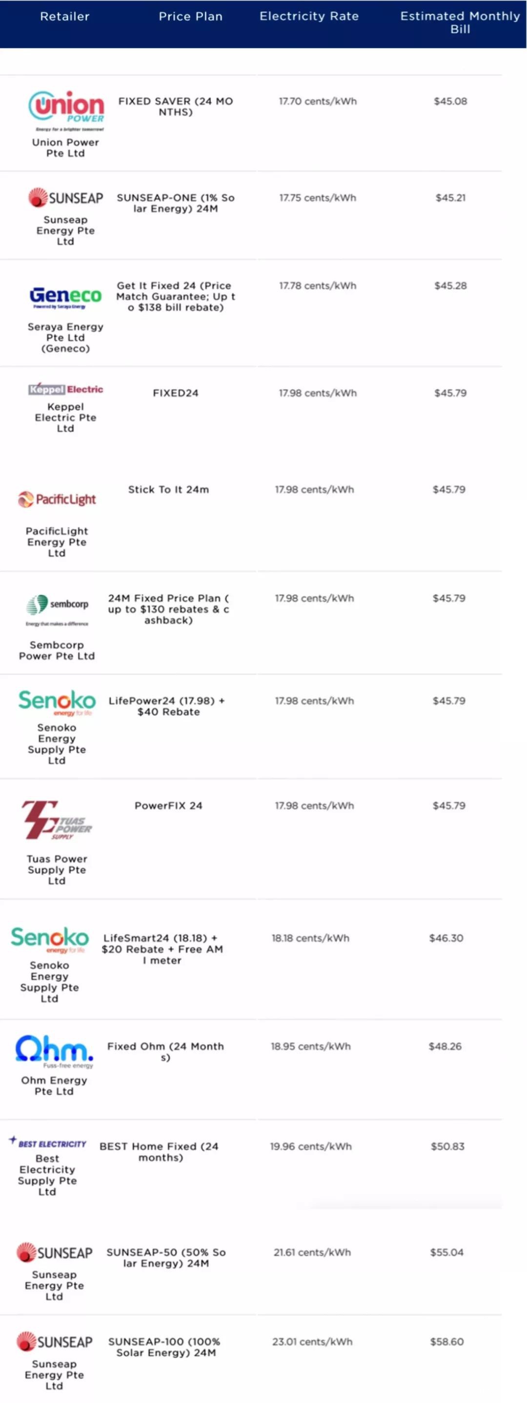 最贵的则是SUNSEAP,收费标准23.01 cents/kWh,预估每月账单58.60新币。