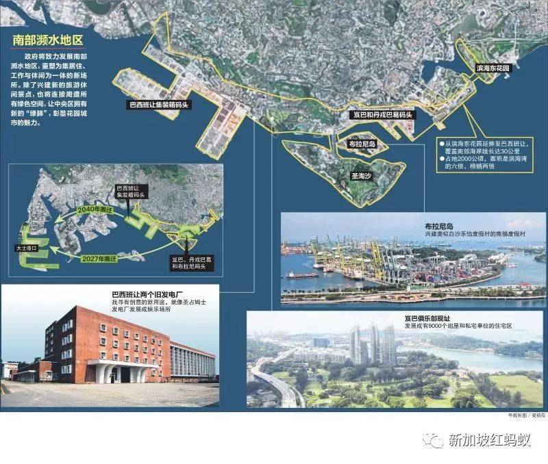 南部濒水地区覆蓋我国南部海岸线30公里,从滨海东花园延伸至巴西班让。土地面积约2000公顷,是滨海湾的六倍,或相当于两个榜鹅。(联合早报)