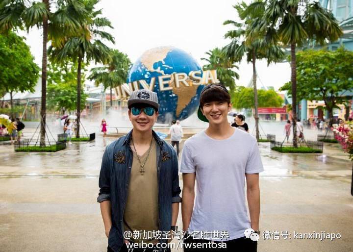 林俊杰和好友怀秋在环球影城门口,快带上你的小伙伴一起去打卡吧!