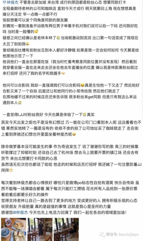 粉丝也发微博感谢了林俊杰,感谢他写了那么多好听的歌帮她度过很多艰难的时刻,希望能在各自的领域里继续加油。