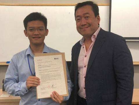 课程期间,NUS Master of Finance (金融硕士)学术主任Johan Sulaeman教授(图左)与学员们分享介绍,Jack Wu吴建华(右图左边)成为暑期课程的Top 2获得金融硕士奖学金,MSc项目总监Aaron Goh为他颁发Prize Letter。
