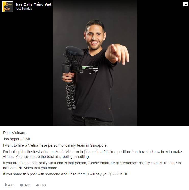 Nas是在两个月前设立的新账户Nas Daily Vietnamese发文。