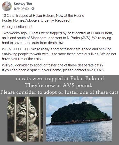 10只猫咪受困在新加坡以南的毛广岛(Pulau Bukom),