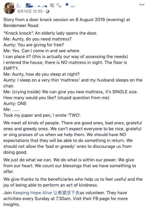 最近,一名叫Lee Siew Yian的志愿者在“Keeping Hope Alive(让希望活下去)”的慈善活动中为弱势群体做家访,以评估他们的需求。