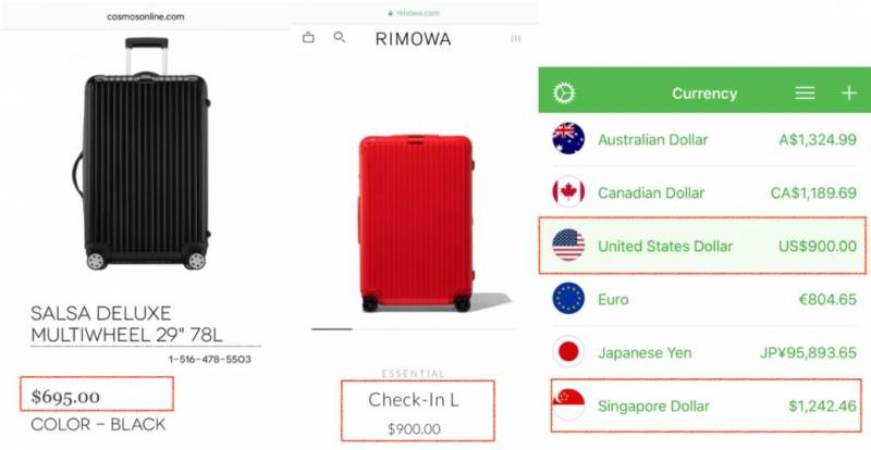 我悄咪咪地上网搜了一下,发现新箱子貌似比我的旧箱子要贵!我的旧箱子是花1080新币左右买,现在网上价格是695美金,约为960新币;但是Rimowa给我换的箱子官网价格900美金,大约要1200新币左右。