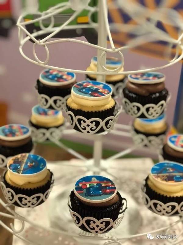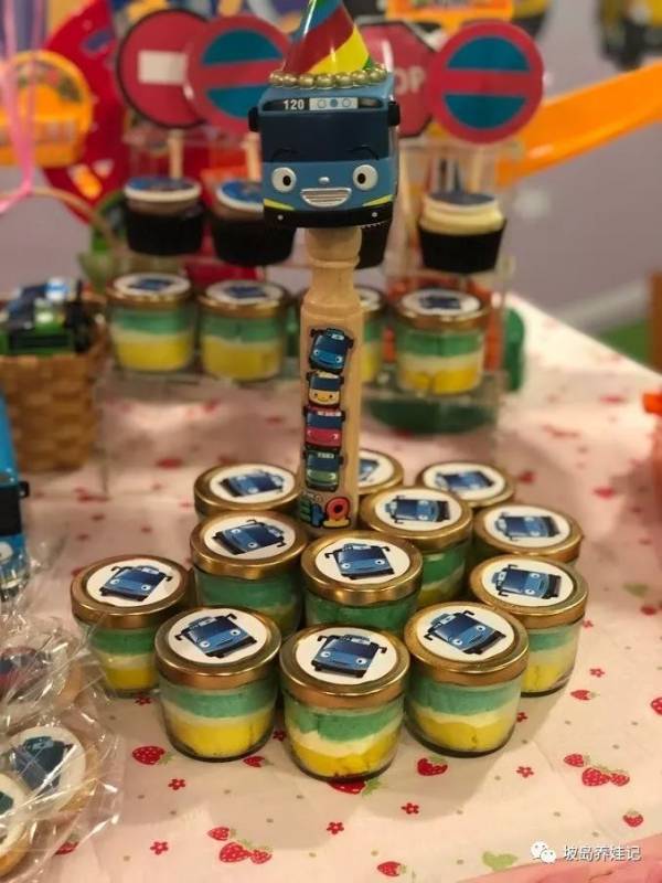 各种Tayo主题的纸杯蛋糕,马卡龙,饼乾和小蛋糕,而我们的大蛋糕也正由嘉芯妈妈带来的路上。