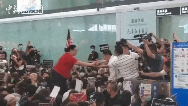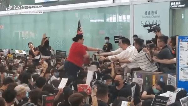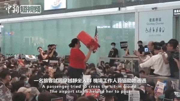 面对香港机场满地示威者,新加坡红衣女子冲了出去